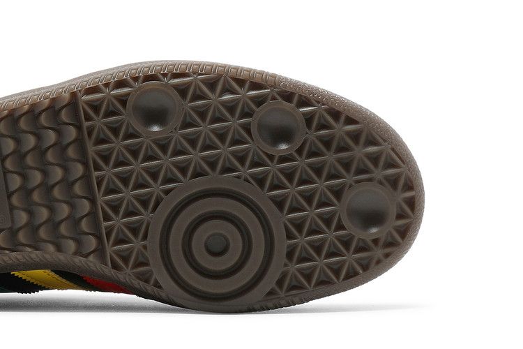 The adidas Samba OG Ajax Bob Marley 3 Little Birds features a black base with green, yellow, and red bands inspired by the Rastafarian flag. Three colored birds adorn the heel for a distinctive rear view. Built on the classic Samba OG silhouette, it includes a cushioned midsole for shock absorption and a premium leather upper for flexibility. The suede T-toe overlay and heel cap enhance both comfort and durability. Released on 2021, the adidas Samba OG Ajax Bob Marley 3 Little Birds is available now at Side Kicks.