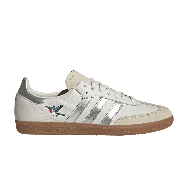 The adidas Samba OG Notting Hill Carnival celebrates London’s annual Caribbean festival. It features a white leather upper with tan suede mudguard and exposed stitching. Metallic silver stripes adorn the quarter panels, while a colorful embroidered hummingbird nods to the carnival theme. The heel counter displays a silver Trefoil logo. Released on August 27, 2022, the adidas Samba OG Notting Hill Carnival is available now at Side Kicks.