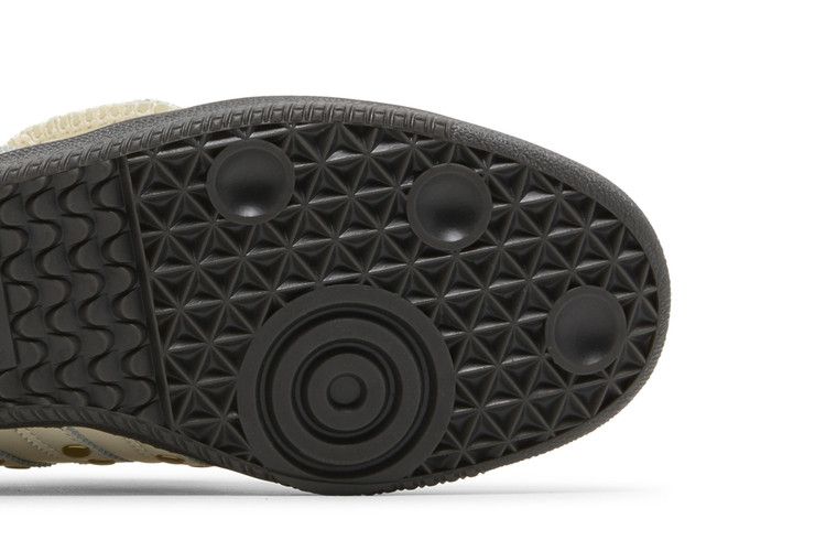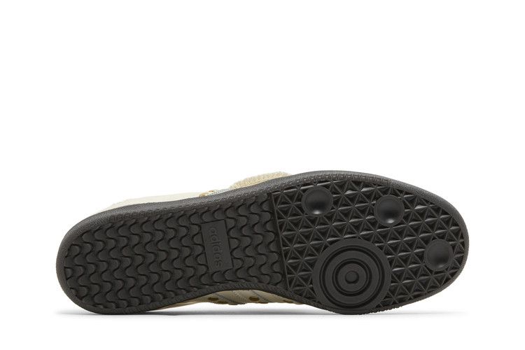 The adidas Samba Wales Bonner Studded Pack in Cream White is part of the 'Studded Pack.' Crafted with a full leather upper and satin lining, it showcases metallic studs on the iconic three-stripes. Featuring deco stitching on the heel tab and fold-over tongue, the design incorporates dual branding on the sockliner and woven tongue tag. The shoe is set atop a durable rubber cupsole, embodying the Wales Bonner Fall/Winter 2023 apparel collection's signature motif and style.