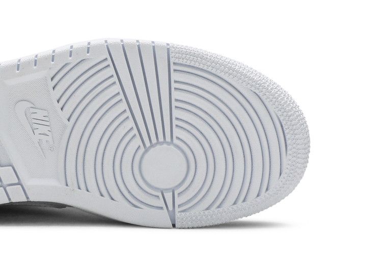 The Jordan 1 Mid White Snakeskin (W) features a clean white leather upper with a snakeskin texture, including the perforated toe box and overlays. A black Jumpman logo appears on the tongue tag and insole, while the white Wings logo subtly accents the collar. The white midsole and rubber outsole provide traction with concentric circle detailing. Released on April 1, 2020, the Jordan 1 Mid White Snakeskin (W) is available now at Side Kicks.