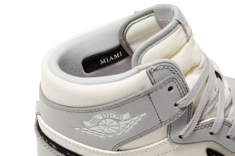 The Jordan 1 Retro High Dior is a collaboration between Dior and Jordan Brand, featuring a white and grey Italian leather upper with hand-painted edges. The design includes a Dior woven tongue tag, a Nike Swoosh in Dior Oblique jacquard, and icy outsoles with Dior and Dior Wings logos. Limited to 8,500 pairs, each shoe is individually numbered. Made in Italy with premium materials, this release showcases a unique blend of luxury and sportswear aesthetics.