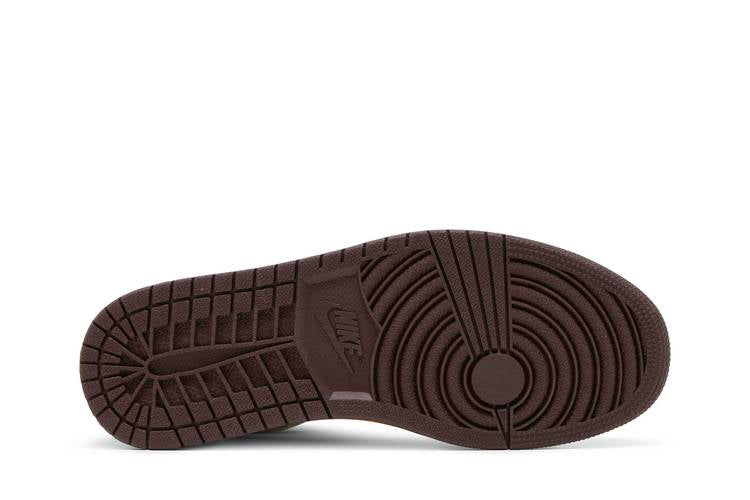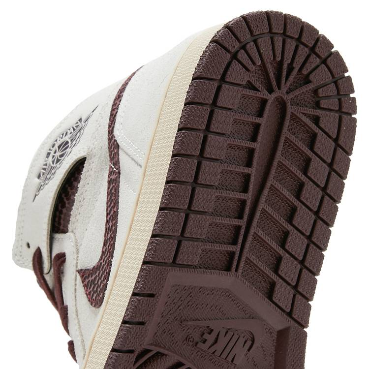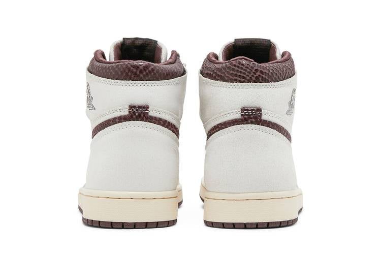 The Jordan 1 Retro High OG A Ma Maniére features a textured suede upper in an off-white finish with premium burgundy snakeskin detailing on the collar and Swoosh. The quilted satin lining adds a luxurious touch, while the Wings logo and MJ's signature are featured on the collar flap. Dual Nike Air and A Ma Maniére logos are found on the woven tongue tag. The shoe sits on a pre-yellowed midsole and burgundy rubber outsole for a vintage look.