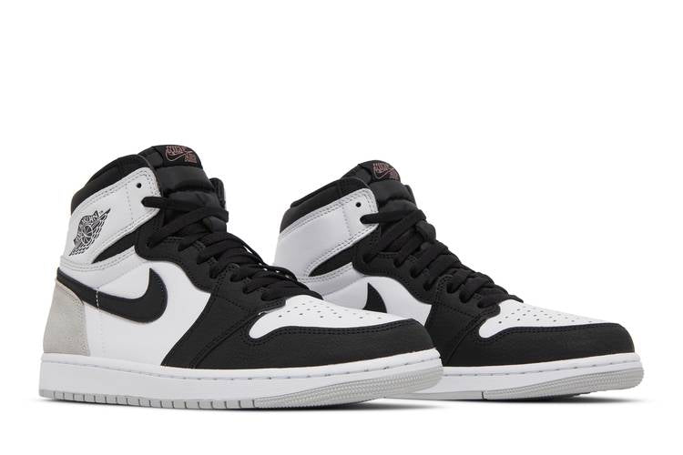 The Air Jordan 1 Retro High OG Bleached Coral features a white leather base with grey suede and cracked black leather overlays. Black accents on the Swoosh and Wings logo complement the Bleached Coral Nike branding on the tongue tag. The rubber cupsole combines white sidewalls with a grey outsole for a classic look. Inspired by the Black Toe theme, this high-top sneaker offers a retro feel with a modern twist.