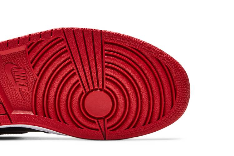 The Air Jordan 1 Retro High OG 'Patent Bred' showcases a glossy patent leather construction in black and Varsity Red. Key design elements include a nylon tongue with a Nike tag, a Wings logo on the collar, and a durable rubber cupsole with an Air-sole unit. This high-top sneaker offers a classic look with a modern twist, perfect for sneaker enthusiasts and collectors.