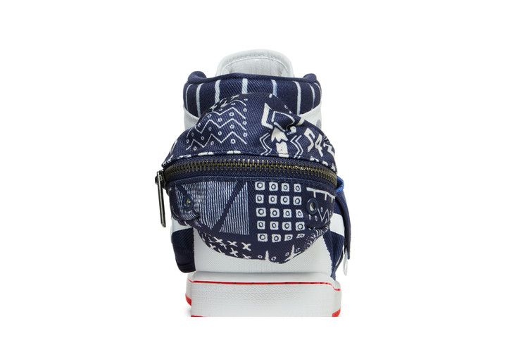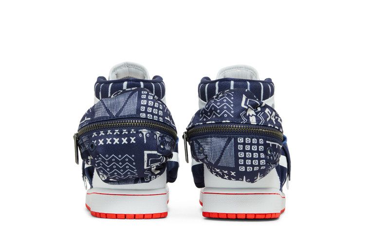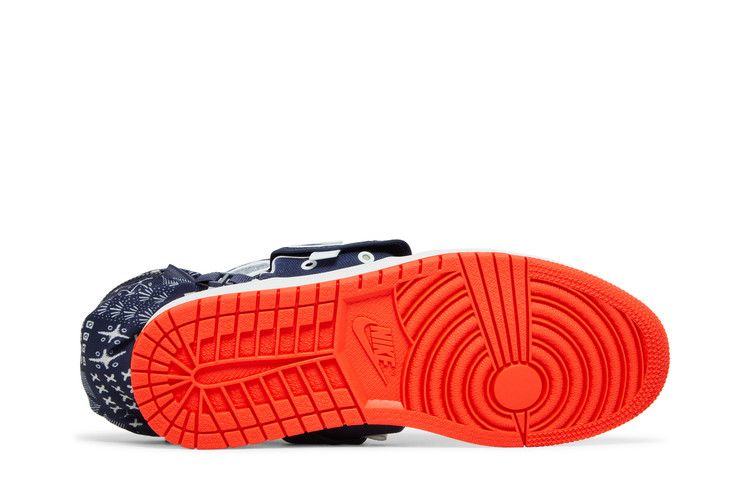 The Air Jordan 1 Retro High OG SP Utility Stash Quai 54 2022 features a collaboration design with Quai 54, incorporating functional pouches on the Swooshes and heel. The upper combines canvas with white overlays over a dark blue base, accented by orange stitching and outsole. A red tag displays collaboration branding. Released on August 30, 2022, the Air Jordan 1 Retro High OG SP Utility Stash Quai 54 2022 is available now at Side Kicks.