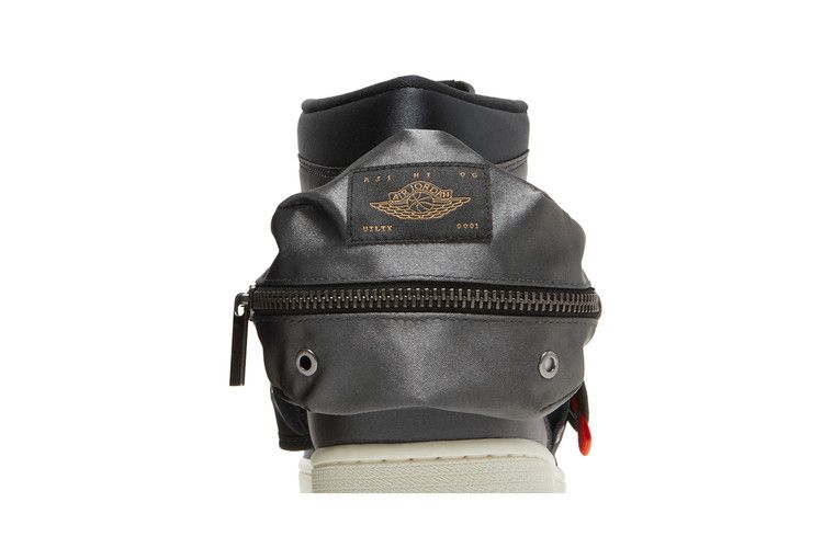 The Jordan 1 Retro High OG SP Utility Neutral Olive Light Steel Grey features a metallic canvas upper in steel gray and olive green. It includes functional stash pockets with black Swoosh logos on the closure flaps and a detachable heel pouch with gold Wings branding. The design incorporates butter yellow laces, a black tongue, and a sail-colored rubber cupsole with Air cushioning. Taxi yellow accents highlight the zipper pull and insole branding. Released on October 7, 2022, the Jordan 1 Retro High OG SP Utility Neutral Olive Light Steel Grey is available now at Side Kicks.
