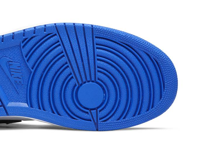 The Air Jordan 1 Retro High OG 'Royal Toe' features a white leather upper with black overlays and Game Royal accents. The shoe includes a padded nylon tongue with a Nike Air tag and the iconic Jordan Wings logo on the collar flap. Inspired by the classic Jordan 1 Royal colorway, this sneaker combines elements of the Black Toe 1 for a fresh take on a beloved design. Available now on StockX.