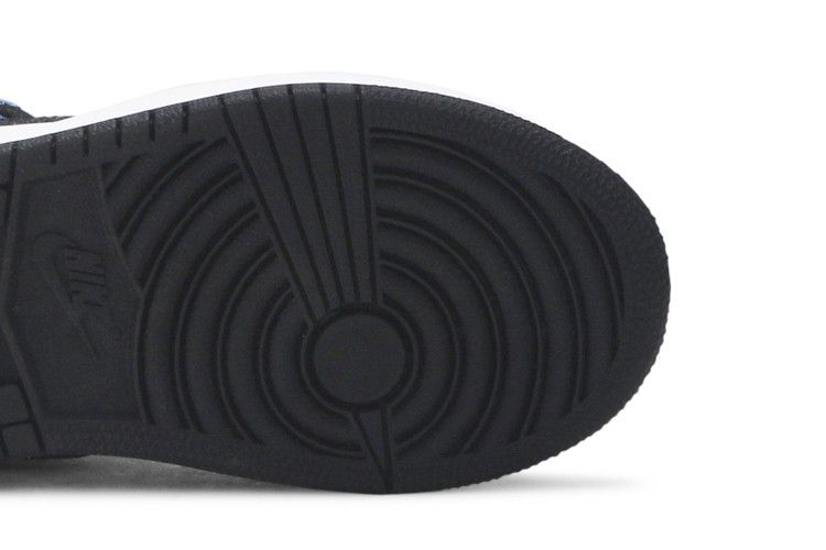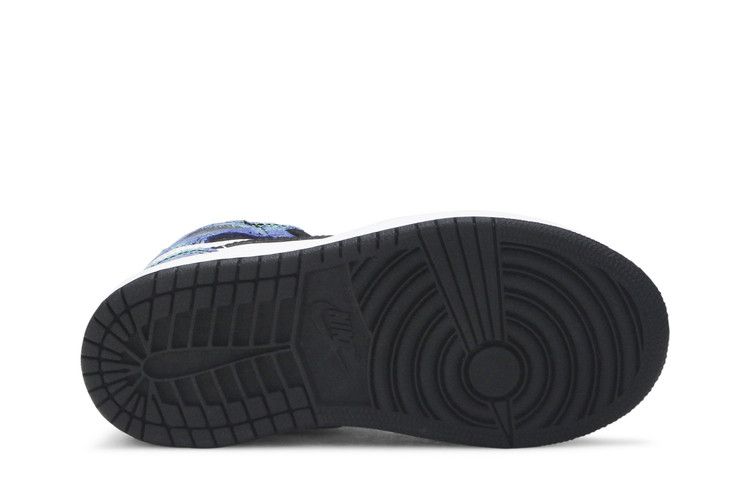 The Jordan 1 Retro High Tie Dye Kids features a white, black, and Aurora Green leather and nylon upper. Black tones cover the toe, collar, nylon tongue, and laces. A black leather Swoosh contrasts with the white center panels, while "Nike Air" branding appears on the tongues and insoles. Released on June 2020, the Jordan 1 Retro High Tie Dye Kids is available now at Side Kicks.