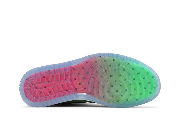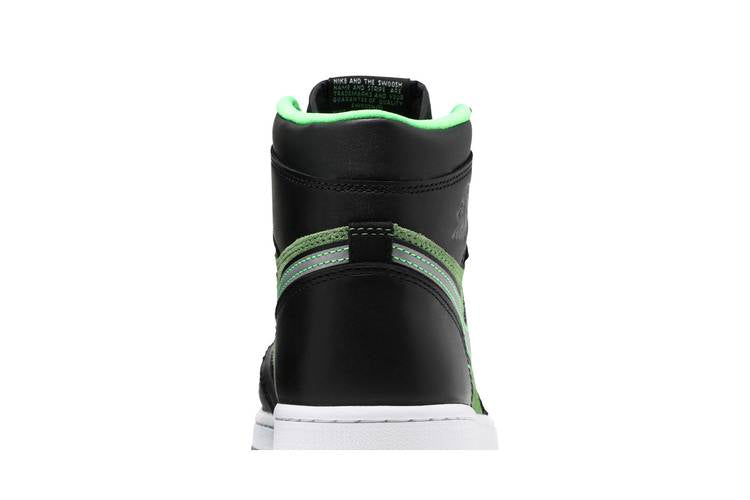 The Air Jordan 1 Retro High Zoom 'Zen Green' features a blend of black leather and green suede on the upper, with a matte silver Swoosh for contrast. The sneaker incorporates Zoom Air cushioning technology for enhanced comfort and support. A woven Zoom Air tongue tag and icy outsole complete the design. Released in 2020, this shoe offers a modern twist on a classic silhouette.