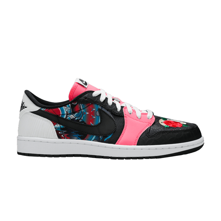 The Jordan 1 Retro Low Chinese New Year (2020) is a limited-edition release celebrating Chinese New Year. It features a mismatched design with suede, leather, and patent leather construction. Chinese graphics appear on the toebox and mid panels, while red roses are embroidered on the right toe and left Swoosh. Additional details include a nylon tongue with pink accents, mismatched laces, 'Wings' logo on the heels, and 3M reflective heel panels. The sole combines a white midsole with black and pink rubber outsoles. Released on February 1, 2020, the Jordan 1 Retro Low Chinese New Year (2020) is available now at Side Kicks.