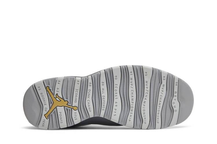 The Air Jordan 10 Retro ‘London’ is part of a City Pack inspired by major cities worldwide. The Cool Grey and dark grey upper reflects London’s overcast skies, with metallic gold accents on the Jumpman branding and ‘LDN’ lettering. The outsole features a bar design highlighting Michael Jordan’s achievements. Originally released in 2016, these basketball sneakers offer a retro design by Tinker Hatfield, with a monochromatic color scheme and classic Air Jordan 10 aesthetic. The collar design provides easy on and off access and extra ankle support.