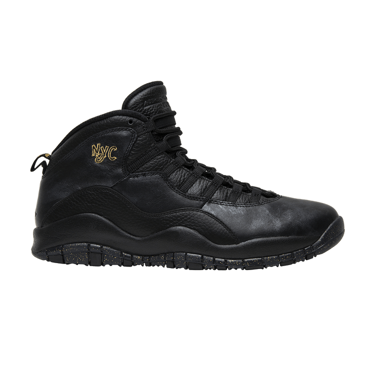 The Air Jordan 10 Retro New York City (2016) features a matte-black leather upper with gold accents on the branding, tongue, heel tab, and sole. The design includes the signature AJ10 checkered pattern on the outsole and a stitched "NYC" on the tongue. A Phylon midsole provides cushioning for comfort. Released on April 27, 2016, the Air Jordan 10 Retro New York City (2016) is available now at Side Kicks.