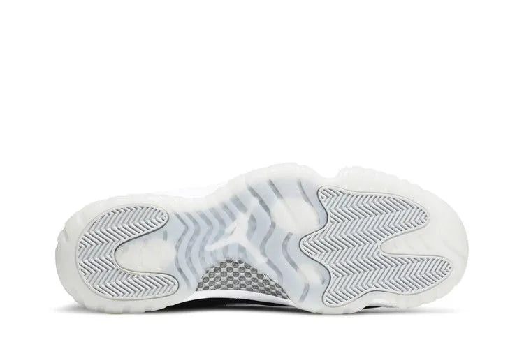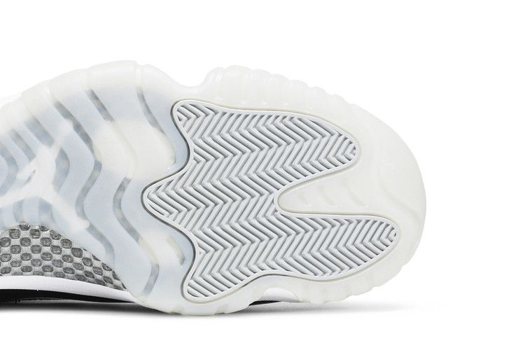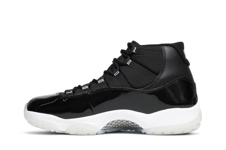 The Air Jordan 11 ‘Jubilee’ commemorates the silhouette's 25th anniversary with a black ballistic mesh and patent leather upper. Featuring metallic Jumpman and ‘23’ branding on the heel, stylized silver ‘Jordan’ lettering on the eyelets, and a white foam midsole with a translucent rubber outsole. Inspired by original sketches from designer Tinker Hatfield, the design delivers a blend of luxury and performance, suitable for both on and off the court. Carbon fiber plating on the sole provides stability and power. Released in December 2020.