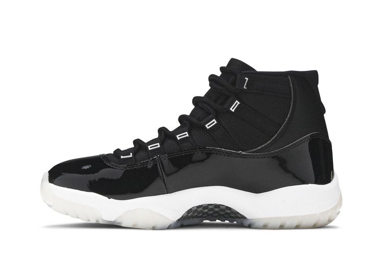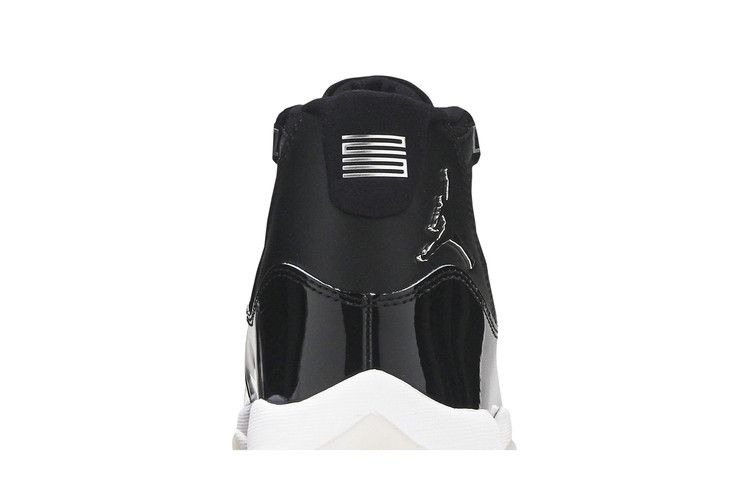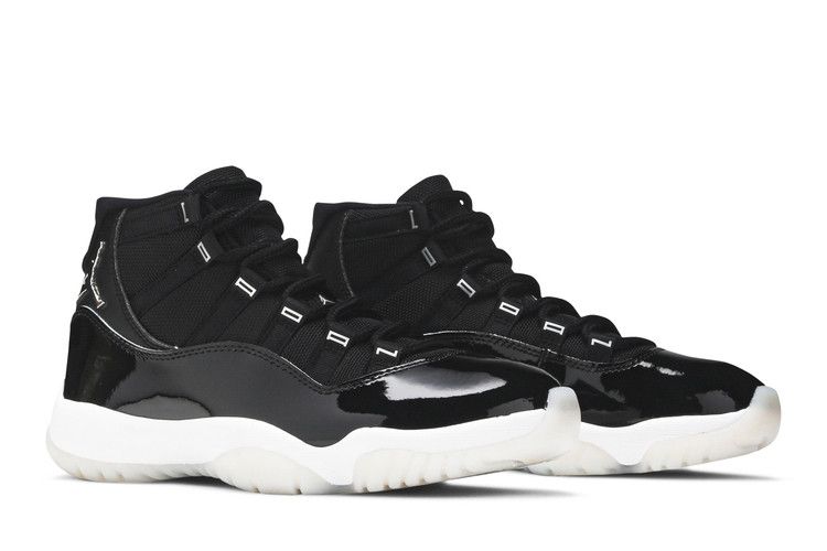 The women's Air Jordan 11 ‘Jubilee’, commemorating the silhouette's 25th anniversary, boasts a sleek black finish blending ballistic mesh and patent leather. The shoe features a 3D metallic Jumpman and '23' branding on the heel, complemented by silver 'Jordan' lettering on the eyelets. Supported by a white foam midsole and translucent rubber outsole, this design signifies the timeless style of the Air Jordan 11.