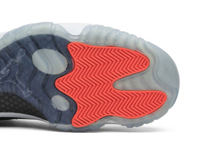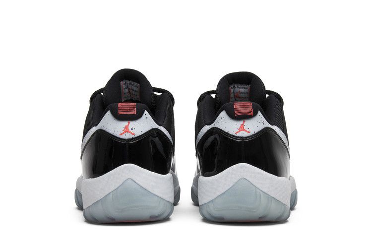 The Air Jordan 11 Retro Low Infrared combines the Infrared 23 color with the classic "Bred" colorway. It has a black mesh upper with black patent-leather overlays, a white midsole, and a translucent red-tinted outsole. The design features a Jumpman logo on the heel and "23" on the heel tab. Released on June 14, 2014, the Air Jordan 11 Retro Low Infrared is available now at Side Kicks.