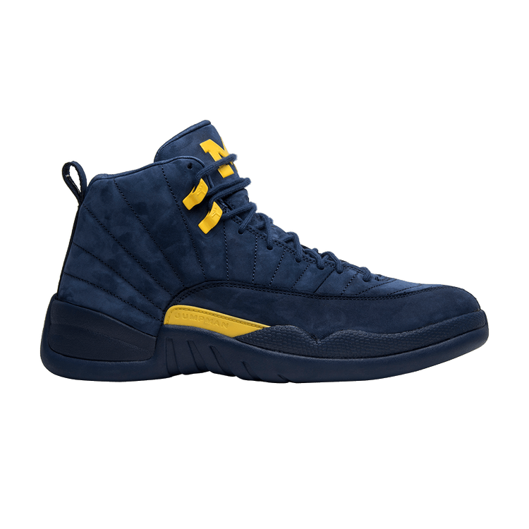 The Jordan 12 Michigan features a college navy upper with amarillo yellow accents, inspired by the Wolverines. It includes the Michigan "M" logo in amarillo on the tongue. Released on June 2018, the Jordan 12 Michigan is available now at Side Kicks.