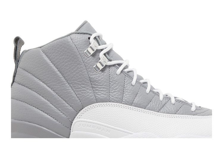 The Jordan 12 Retro Stealth (PS) features a grey tumbled leather upper with stitched lines and white lizard-textured overlays. Jumpman branding appears on the tongue, heel tab, and metallic silver eyelets. A white Phylon midsole with Zoom Air cushioning provides lightweight support, while the lace closure and heel pull tab ensure a secure fit. Released on August 27, 2022, the Jordan 12 Retro Stealth (PS) is available now at Side Kicks.