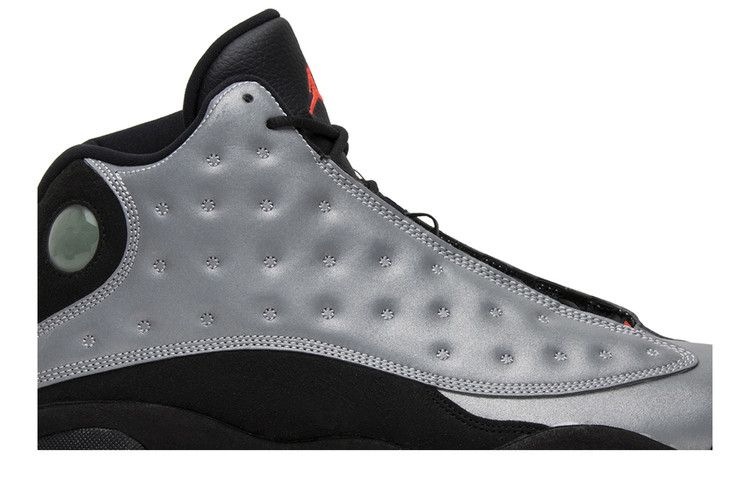 The Jordan 13 Retro 3M Reflective Silver features a reflective silver upper with black leather and nubuck overlays. Infrared accents highlight the Jumpman tongue branding, while black appears on the tongue, laces, and sockliner. A hologram with '23' branding sits on the lateral ankle, paired with a black midsole and infrared paw print outsole. Released on October 4, 2014, the Jordan 13 Retro 3M Reflective Silver is available now at Side Kicks.
