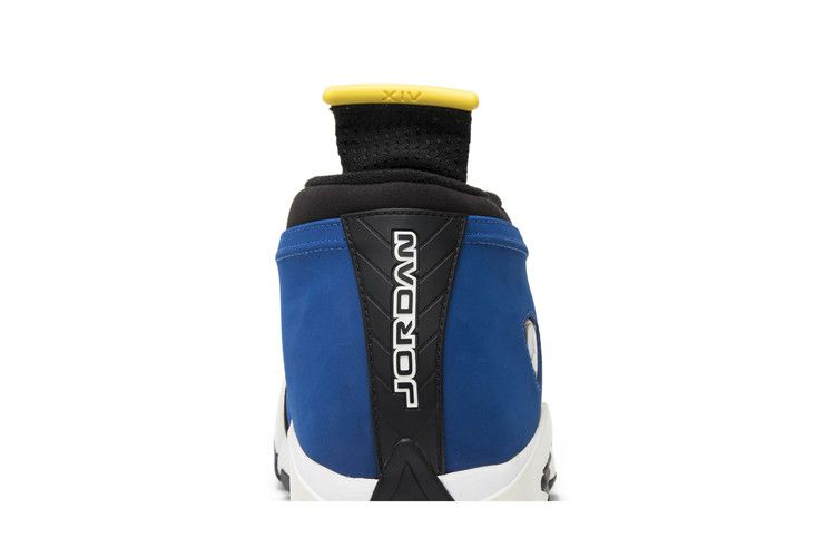 The Air Jordan 14 Retro Low Laney 2015 features a varsity royal blue upper crafted from nubuck and leather, accented with black and white details. Inspired by Ferrari design, it includes ribbed side panels resembling air vents and a carbon fiber shank plate. A full-length Zoom Air unit provides lightweight cushioning and impact protection. Yellow accents on the tongue tab and Jumpman logo enhance the colorway. Released on October 3, 2015, the Air Jordan 14 Retro Low Laney 2015 is available now at Side Kicks.