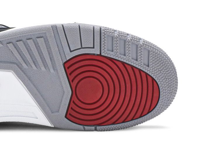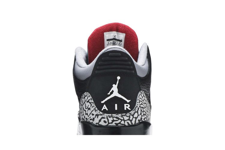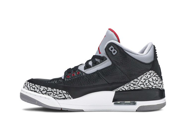 The Air Jordan 3 Retro OG "Black Cement" features a black leather upper with cement grey, fire red, and white accents, along with elephant print detailing. This 2018 remastered edition reintroduced the original "Nike Air" branding for men's and gradeschool sizes, while preschool and toddler sizes feature "Jumpman" branding. Released on February 17, 2018, the Air Jordan 3 Retro OG is available now at Side Kicks.