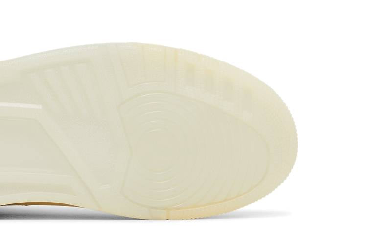 The J Balvin x Air Jordan 3 Retro 'Medellín Sunset' features an ivory-colored leather upper with tonal elephant print overlays. The rear midsole showcases a gradient blend of yellow, orange, and dark purple, with mismatched Nike branding on the left shoe and J Balvin's smiley face icon on the right. An embroidered gold Jumpman logo adorns the tongue, while a blue-tinged translucent rubber outsole provides traction. Inspired by the sunsets of Medellín, Colombia, this special edition sneaker combines vibrant colors with iconic design elements for a unique look.
