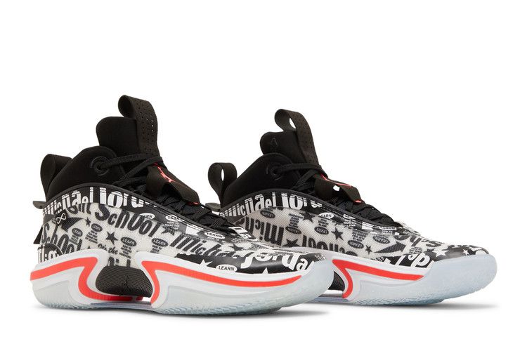 The Air Jordan 36 Flight School features a black and white colorway with "Jordan Flight" typography and Infrared 23 accents. It includes a full-length Zoom Air unit and stacked forefoot Zoom Air for responsive cushioning. The lightweight mesh upper with synthetic overlays enhances breathability, while the rubber outsole provides multi-surface traction. Heel and tongue pull tabs offer easy on-off access. The midsole incorporates an articulated eclipse plate for smooth transitions during play. Released on June 16, 2022, the Air Jordan 36 Flight School is available now at Side Kicks.