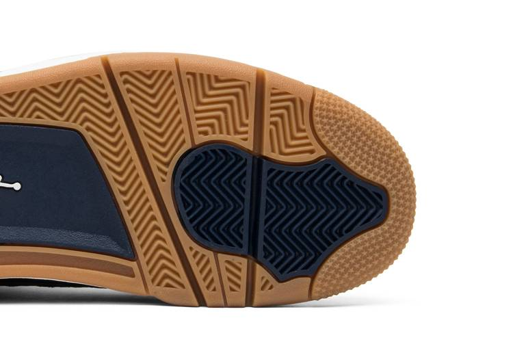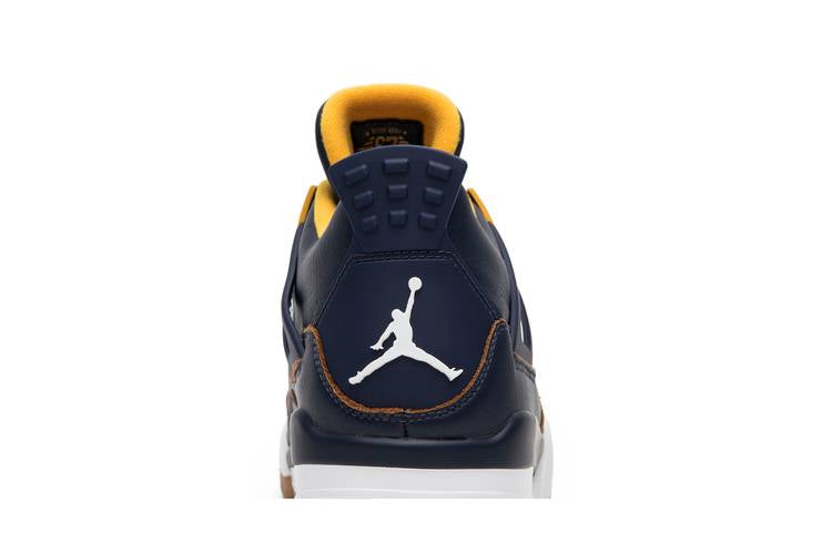 The Air Jordan 4 Retro Dunk From Above sneaker features a navy blue leather upper with white mesh netting, Varsity Maize accents, a white midsole, and a rubber gum outsole. Inspired by Michael Jordan's dunking abilities, the design incorporates colors of the sky and a pilot's uniform. Metallic gold eyelets add a touch of elegance, while Air-Sole units in the forefoot provide comfort and impact absorption. Released in May of 2016 as part of the 'Dunk from Above' collection, this sneaker pays homage to Jordan's iconic basketball career.