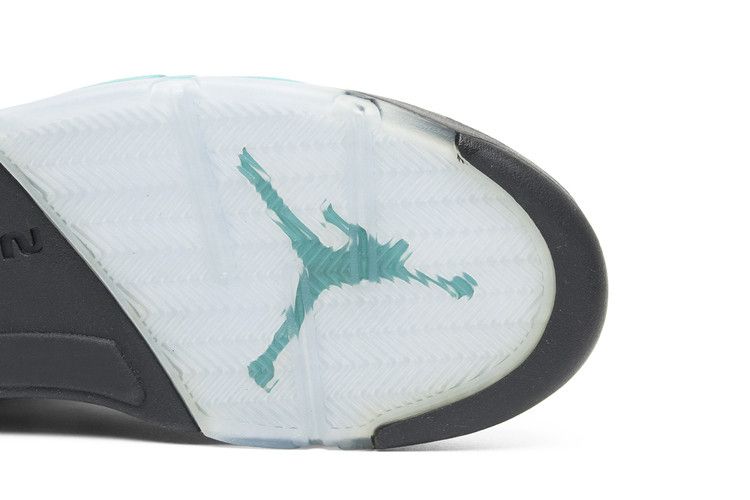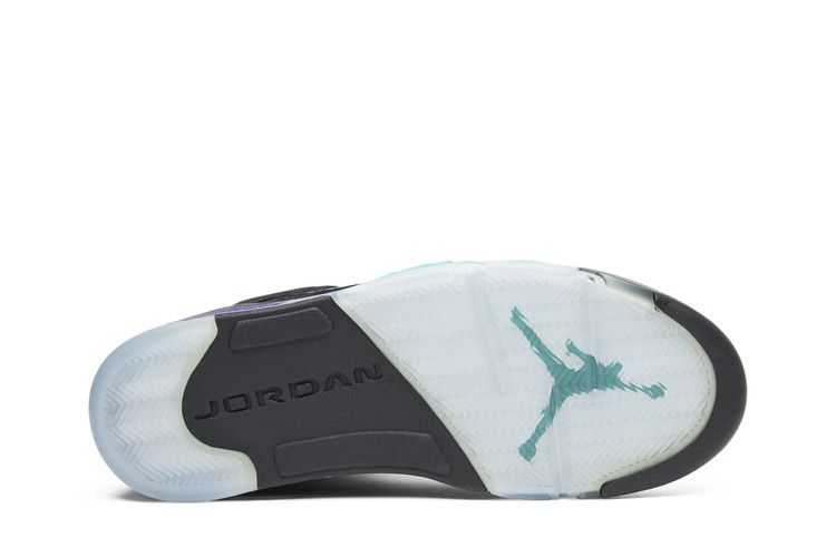 The Air Jordan 5 Retro Black Grape 2013 features a black nubuck upper with New Emerald and Grape Ice accents. Its midsole includes purple and turquoise detailing, contrasting with the Ice-Blue outsole and shark-tooth design. The shoe uses a black lacing system and incorporates Nike Air cushioning with Air-Sole units for support. The upper combines synthetic leather, mesh, and nubuck for durability. Released on June 15, 2013, the Air Jordan 5 Retro Black Grape 2013 is available now at Side Kicks.