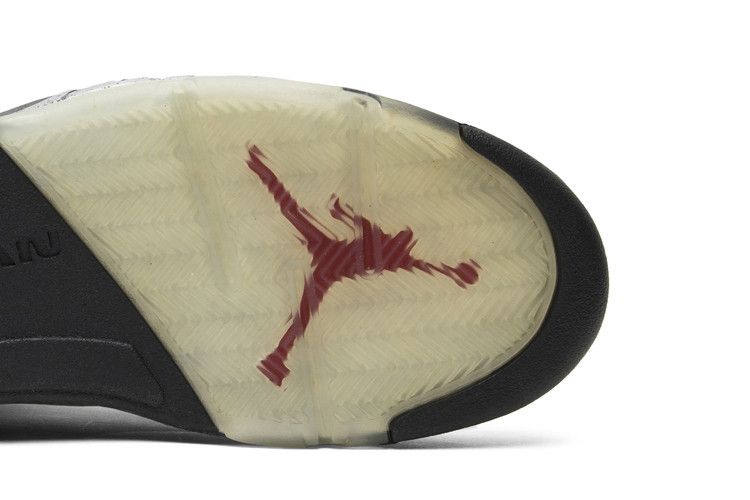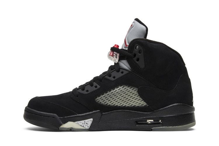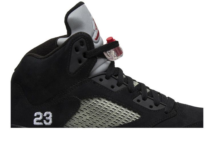 The Jordan 5 Retro Black Metallic (2011) features a black nubuck leather upper with plastic mesh side panels and a translucent lace lock. The white midsole includes visible Air cushioning for impact protection, while the translucent rubber outsole provides grip with a herringbone pattern. Metallic silver accents highlight the Jumpman logo, "23" embroidery, and lace eyelets. Released on August 20, 2011, the Jordan 5 Retro Black Metallic is available now at Side Kicks.