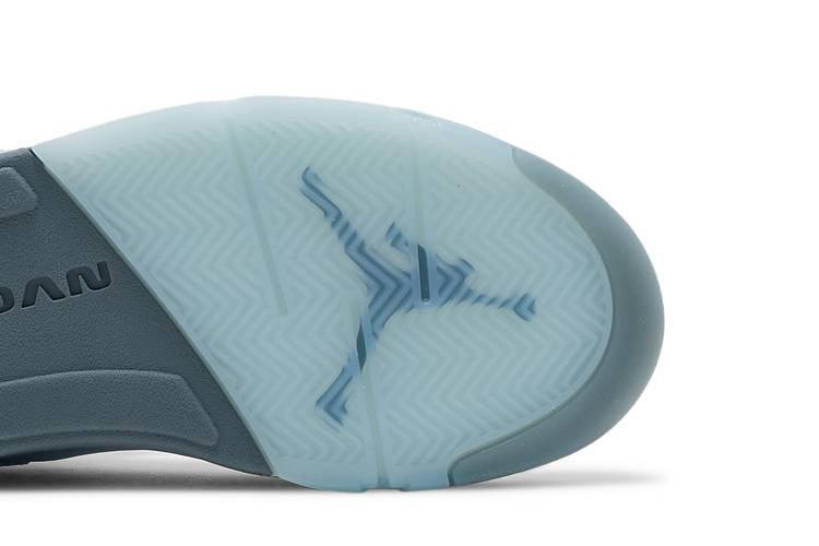The women's Air Jordan 5 Retro 'Blue Bird' presents a vibrant take on the retro silhouette. Its suede upper showcases a vivid shade of blue with iconic AJ5 elements such as lace locks, TPU eyelets, and clear netting. The shoe highlights a silver reflective tongue boasting a blue Jumpman logo and a polyurethane midsole detailed with silver shark tooth accents. The icy blue rubber outsole provides excellent traction with a herringbone pattern. This edition draws inspiration from outdoor elements with its color scheme and design components.