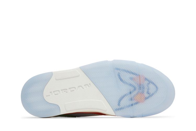 The Air Jordan 5 Low Doernbecher Freestyle Michael features an orange, green, blue, and red Durabuck upper with semi-translucent TPU netted inserts and a black tongue. Macaroni and cheese-inspired graphics adorn the vamp, while "Take Flight" and Jumpman embroideries highlight the heel. A white and red midsole pairs with an icy blue semi-translucent outsole. Released on April 2022, the Air Jordan 5 Low Doernbecher Freestyle Michael is available now at Side Kicks.