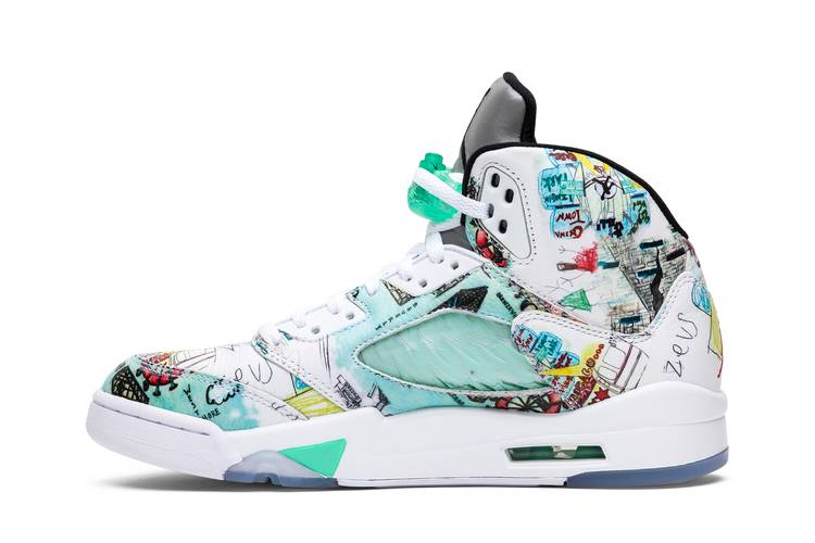 The Jordan 5 Retro Wings feature a white leather upper adorned with doodles and drawings by students from Little Black Pearl. The design pays homage to the educational mission of the Wings scholarship fund founded by Michael Jordan. The shoe also includes the Jordan ‘Wings’ logo and the statement ‘Everyone Can Fly’ on the tongue. The sneaker boasts bright green accents, a white midsole, and a translucent sole. Released in September 2018, this unique and meaningful design is a must-have for sneaker enthusiasts.