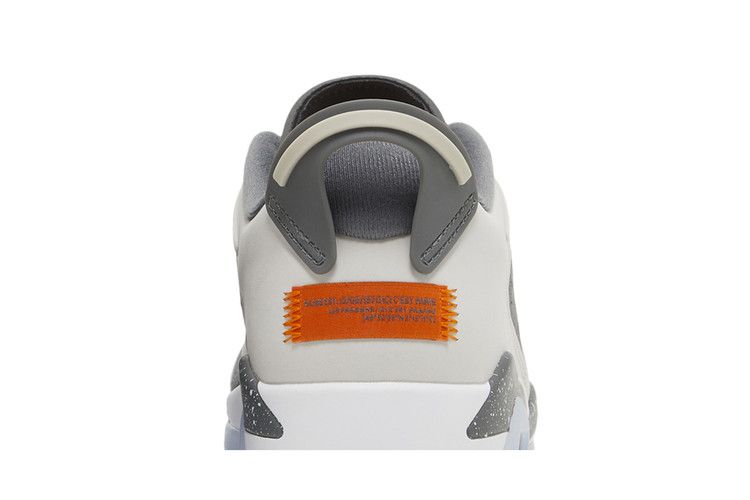 The Air Jordan 6 Retro Low PSG (2023) features a Light Bone and Iron Grey upper with white accents. Magma orange highlights the Jumpman logo on the tongue and heel patch. The midsole has a speckled pattern, while the translucent outsole has a light blue tint. Released on September 20, 2023, the Air Jordan 6 Retro Low PSG (2023) is available now at Side Kicks.