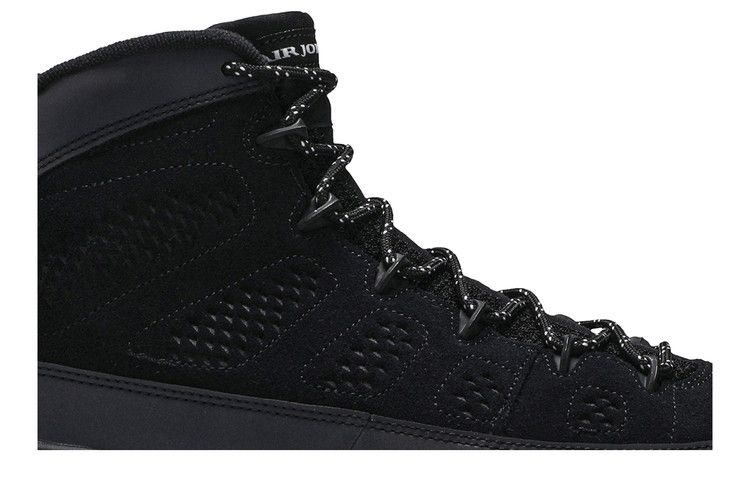 The Air Jordan 9 Retro Racer Blue features black nubuck with an overlay wrapping around the collar, heel, and upper base, finished with an iridescent reflective detail. Racer blue accents highlight trademark elements, while a light gray rubber sole and black midsole maintain a neutral palette. A racer blue Jumpman logo appears on the midsole near the heel tab, complemented by a white rubber outsole. Released on January 15, 2020, the Air Jordan 9 Retro Racer Blue is available now at Side Kicks.