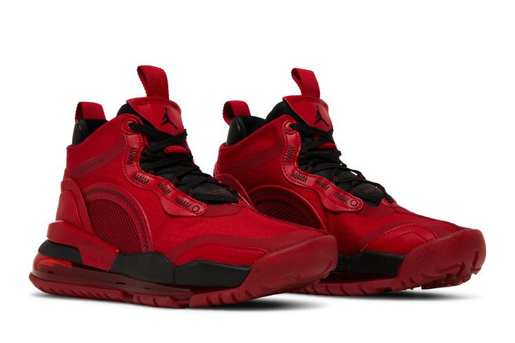 The Jordan Aerospace 720 White Gym Red Black features a high-top silhouette with a white synthetic upper and black overlays. Red accents include side panel stitching, heel pull-tab dots, and tongue tabs. A white Jumpman logo appears on the tongue, while Aerospace 720 branding is stamped on the collar. The midsole incorporates a 720 Air unit for cushioning, paired with a white rubber outsole for traction. Deep grooves and Air 720 branding complete the design. Released on January 1, 2020, the Jordan Aerospace 720 White Gym Red Black is available now at Side Kicks.