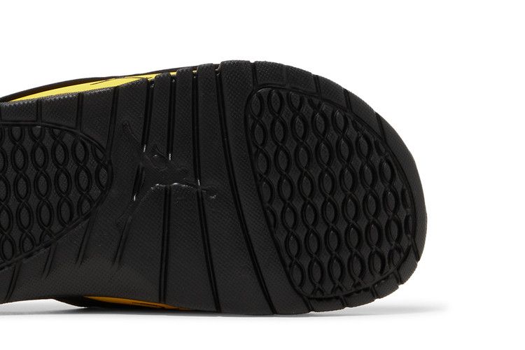 The Jordan Hydro 4 Slide Thunder features a black and Tour Yellow colorway inspired by the Air Jordan 4. The upper includes a nubuck midfoot strap with TPU mesh detailing and an adjustable Velcro closure. A plush lining and gel-like dual-injection foam footbed provide comfort, while Jumpman logos and "Flight" lettering add branding. The lightweight sole has a rubber outsole with traction treads. Released on March 3, 2023, the Jordan Hydro 4 Slide Thunder is available now at Side Kicks.