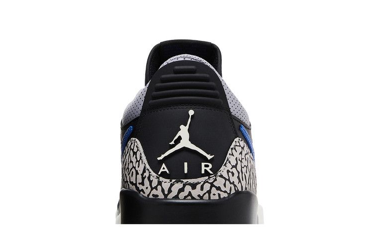 The Air Jordan Legacy 312 Low Black Royal features a hybrid design inspired by classic Jordan models. The black upper includes blue accents on the Swoosh and toe box, with grey collar lining and elephant print detailing on the heel. A white midsole contrasts with the grey and white outsole. The design incorporates a midfoot strap and padded collar for a secure fit, along with a visible Air unit in the heel for cushioning. Released on July 1, 2019, the Air Jordan Legacy 312 Low Black Royal is available now at Side Kicks.