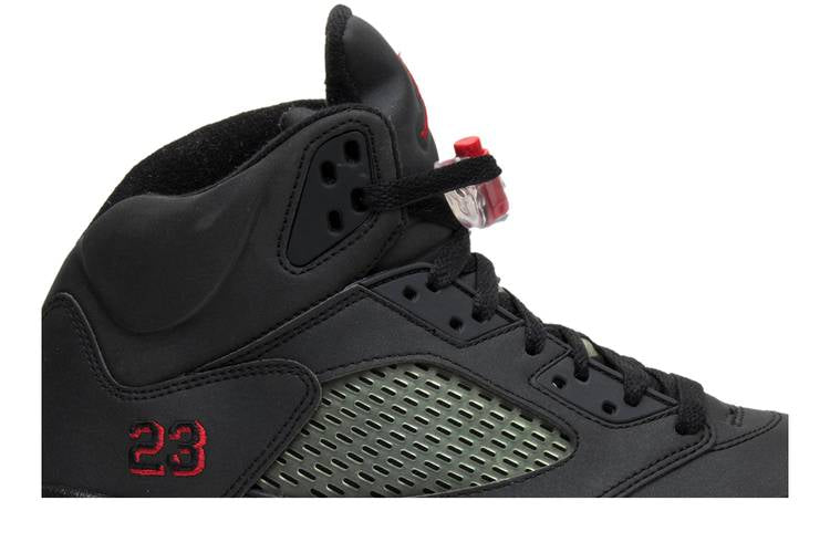 The Jordan Raging Bull Pack (5/5) was released in 2009 to honor Michael Jordan's career achievements. This pack includes two Air Jordan 5 Retro sneakers inspired by the 'Running of the Bulls' event in Spain. One shoe features a Varsity Red suede upper with black accents, a reflective silver tongue, and red shark tooth detailing on the midsole. The other shoe has a black synthetic upper with a 3M reflective finish, Jumpman branding, and embroidered '23' on the heel. Celebrating MJ's first NBA championship win, these sneakers are a must-have for any Jordan fan.