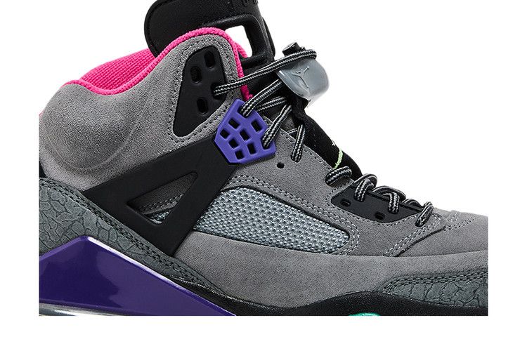 The Jordan Spizike 270 Boot Smoke Gray reinterprets Spike Lee’s Spizike with winter-ready updates. It features a suede upper with mesh side panels, nodding to its basketball roots. Smoke Gray dominates the base, accented by Barely Volt, purple, and fuchsia details. The padded collar includes fuchsia knit lining, while purple plastic highlights the midsole and lace cage. A neon yellow 'Brooklyn' graphic appears on the heel, and elephant print leather covers the mudguard and heel overlay. The design incorporates a visible Air Max 270 unit for cushioning. Released on October 1, 2020, the Jordan Spizike 270 Boot Smoke Gray is available now at Side Kicks.