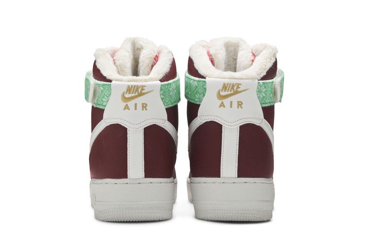 The Nike Air Force 1 High Nordic Christmas (2020) features a festive design with team red overlays and snowflake prints on the quarter panels and toe box. It includes gold AF1 dubraes, faux fur collar lining, and a stitched Swoosh on the ankle strap. Released on December 19, 2020, the Nike Air Force 1 High Nordic Christmas (2020) is available now at Side Kicks.