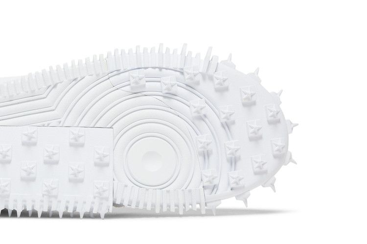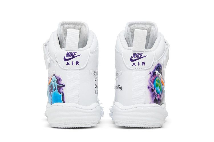 The Nike Air Force 1 Mid Off-White Graffiti White has a leather upper with adjustable ankle straps and a dual lacing system for stability. It features see-through Swoosh logos, a Grim Reaper graphic, and Off-White branding on the inner side. The tongue includes 'Air' embroidery in purple, while the wavy midsole houses an Air-sole unit with orange accents. The rubber outsole has a spiked pattern for traction. Released on June 22, 2023, the Nike Air Force 1 Mid Off-White Graffiti White is available now at Side Kicks.
