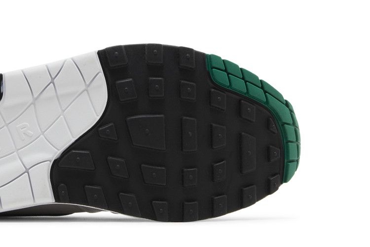 The Nike Air Max 1 ’87 Malachite (Women's) features a Neutral Gray base with Malachite accents on the retro-inspired silhouette. It includes a wavy mudguard, visible Air units, and woven synthetic upper with layered Neutral Gray overlays. The mudguard and Swoosh logos are finished in shiny satin, while Malachite highlights appear on the eyelets, tongue tag, and heel branding. A rubber outsole combines white, black, and Malachite for traction. Released on March 7, 2024, the Nike Air Max 1 ’87 Malachite (Women's) is available now at Side Kicks.