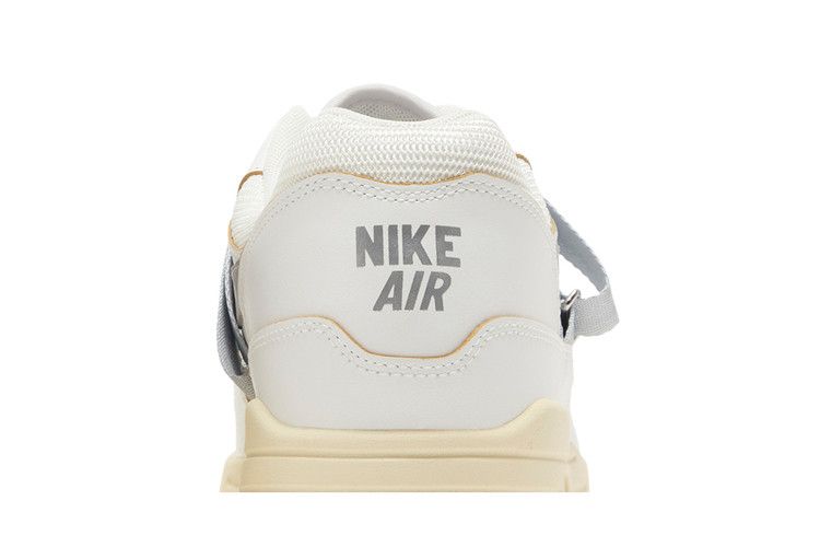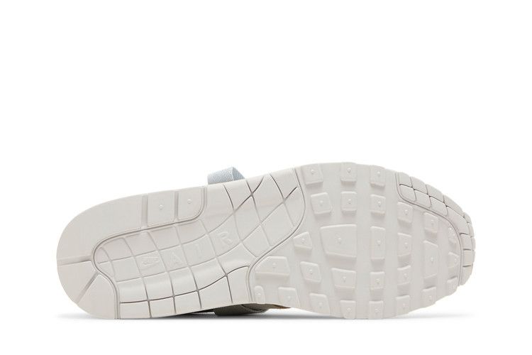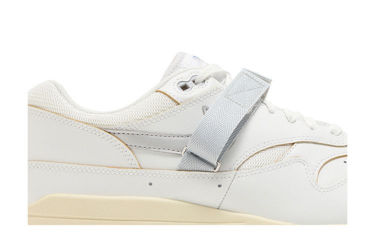 The Nike Air Max 1 Time Warp blends design elements from the Air Force 1 into the Air Max 1 silhouette. It features a white tumbled leather upper with perforations, a gray textile strap, and a gray leather Swoosh. The sail foam midsole includes visible Air cushioning, while the white rubber outsole has heritage waffle lugs. Warped clock graphics on the insoles highlight the time-inspired theme. Released on April 11, 2023, the Nike Air Max 1 Time Warp is available now at Side Kicks.