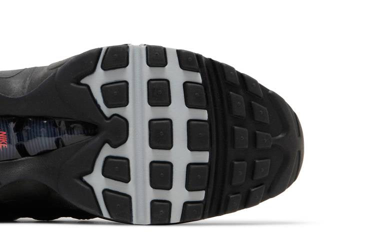 The Nike Air Max 95 Track Red Smoke Grey features a pigmented colorway of Black, Smoke Grey, Anthracite, and Track Red. Inspired by 1990s running aesthetics and the human form, this shoe includes a small Swoosh embroidered near the lateral heel, "Air Max" tongue tag, and visible Nike Unit in the heel in Track Red. The upper is composed of mesh with wavy leather side panels, while the foam midsole and chunky rubber outsole provide comfort and durability. Released on July 27th, 2023.
