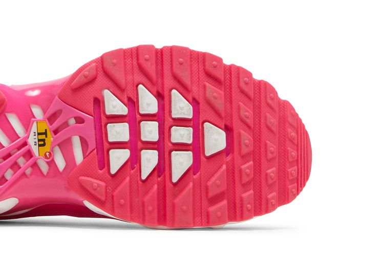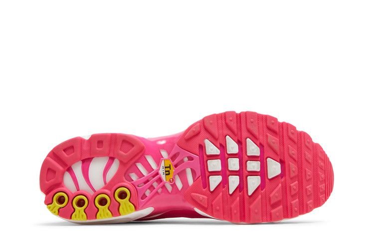 The Nike Air Max Plus Hot Pink White (Women's) features a mesh upper in hot pink with a tonal plastic cage inspired by palm trees. Synthetic overlays on the mudguard and heel add structure, while a white-outlined Swoosh and yellow Tuned Air patch provide contrast. The midsole includes a hot pink midfoot plate and visible pink-tinted Max Air units for cushioning, paired with a hot pink rubber outsole. Released on January 25, 2022, the Nike Air Max Plus Hot Pink White (Women's) is available now at Side Kicks.